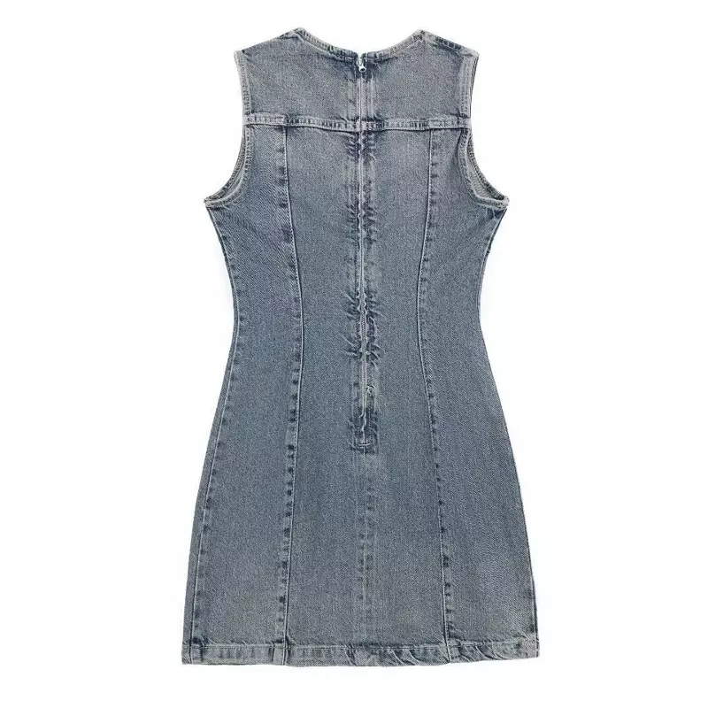 This denim vest dress is made of high-quality cotton denim, offering both comfort and durability. The classic vest design, paired with an A-line skirt hem, makes one look slimmer and taller. The front pocket decoration adds a casual touch, and the side invisible zipper makes it convenient to put on and take off. Whether worn as an inner layer with a T-shirt or a shirt, or alone, it can easily create various styles.